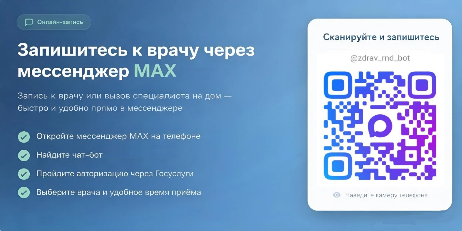 Записаться на прием к врачу теперь можно с помощью национального мессенджера МАХ! Это новый, простой и быстрый способ записи на необходимую медицинскую услугу, что значимо