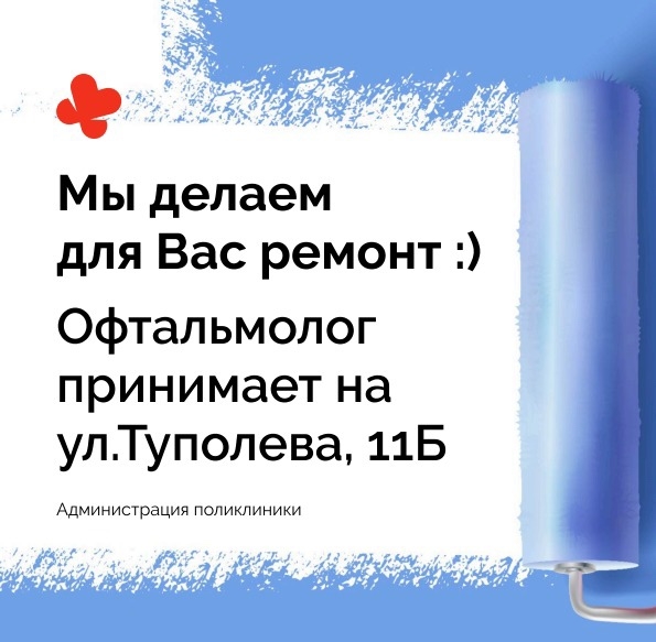 С 1 ноября кабинет офтальмологов по адресу ул. Сержантова, 3 временно закрыт на ремонт. Все врачи-офтальмологи ведут приём на ул. Туполева, 11Б (Амбулаторный центр