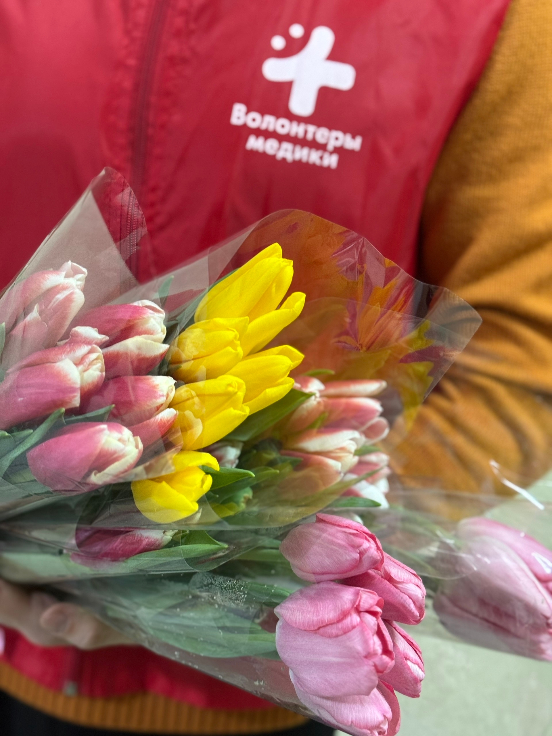К праздничной инициативе сотрудников поликлиники присоединились волонтёры-медики. Вместе они навестили филиалы городской поликлиники №1, чтобы также поздравить сотрудниц с наступающим праздником и подарить женщинам праздничное